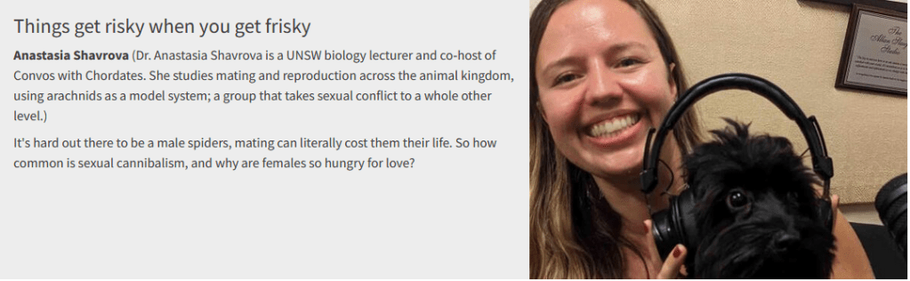 Dr. Anastasia Shavrova is a Lecturer in Ecology and Evolution at the University of New South Wales (UNSW), science communicator, and co-host of Convos with Chordates — a podcast where two scientists talk about life, unscientifically. Her work translating complex ideas for general audiences has taken her from ABC National Radio to Splendour in the Grass and the Sydney Comedy Festival.