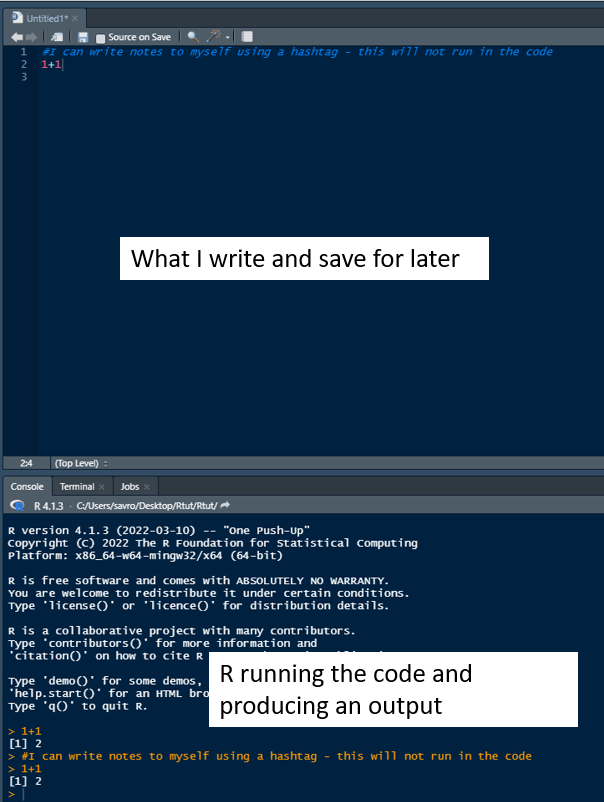 If you go to File > New script, you can open up an extra panel in R, your R script (right panel in image below), where you can write your code and save it to come back to it. The R Console (left panel in image below), is where R runs your code. If you write your code in the Console, R will run your code, but will not save your code for later.
