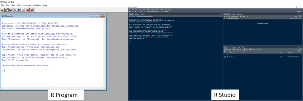 Let me stress this again, R is the program, but R studio is the extension. This is why you can use R, the program, on its own, but you cannot run R studio without having R, the program, on your computer. It would be like trying to run an AdBlocker extension with no browser.