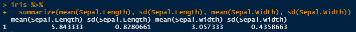 summarize() = Let’s find the mean and standard deviation of Sepal Length and Width: