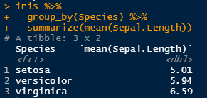 Last but not least lets try group_by(). Lets say you don’t care for the average of all of Sepal.Length in total, but instead want to know the average Sepal.Length for each species.